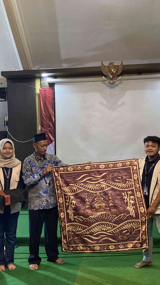 Anggota KKM Aruna (Pasa dan Fitriyatil) bersama Kepala desa memegang batik Arum Tirto Wojo (Sumber dokumentasi asli dari KKM Aruna)